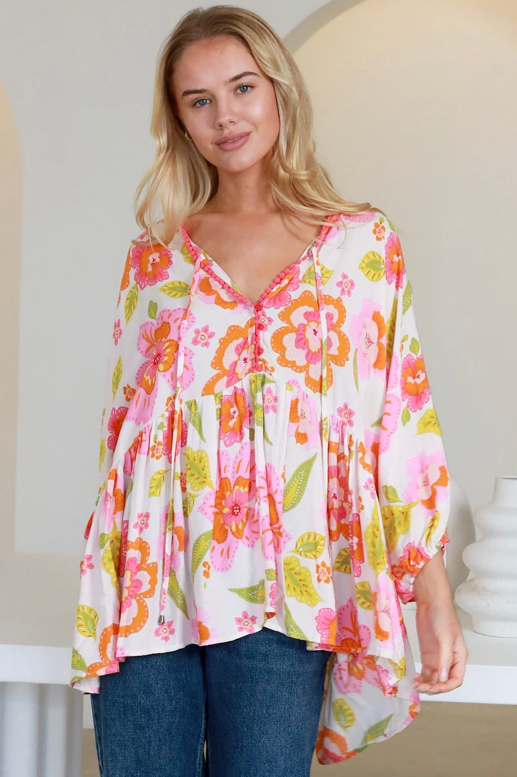 A soft whisper of spring, a touch of summer — The Isla Grace Top arrives in a palette that glows with warmth. Crafted from 100% smooth rayon, its pure white base blooms with painterly florals in shades of pink, orange, and lime-green. Every detail is considered: a flattering v-neckline framed by delicate neckties finished with tiny beaded tips, gently elasticised three-quarter sleeves, and a feminine peplum hem that falls shorter at the front and sweeps longer at the back.